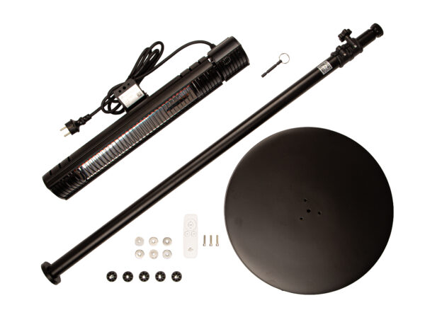 El PACK incluye el soporte a piso para el calefactor en acero, ajustable en altura, color: negro, altura del producto: 180.8 cm, diámetro de base: 44.2 cm, peso: 10.8 kg, garantía: 6 meses.